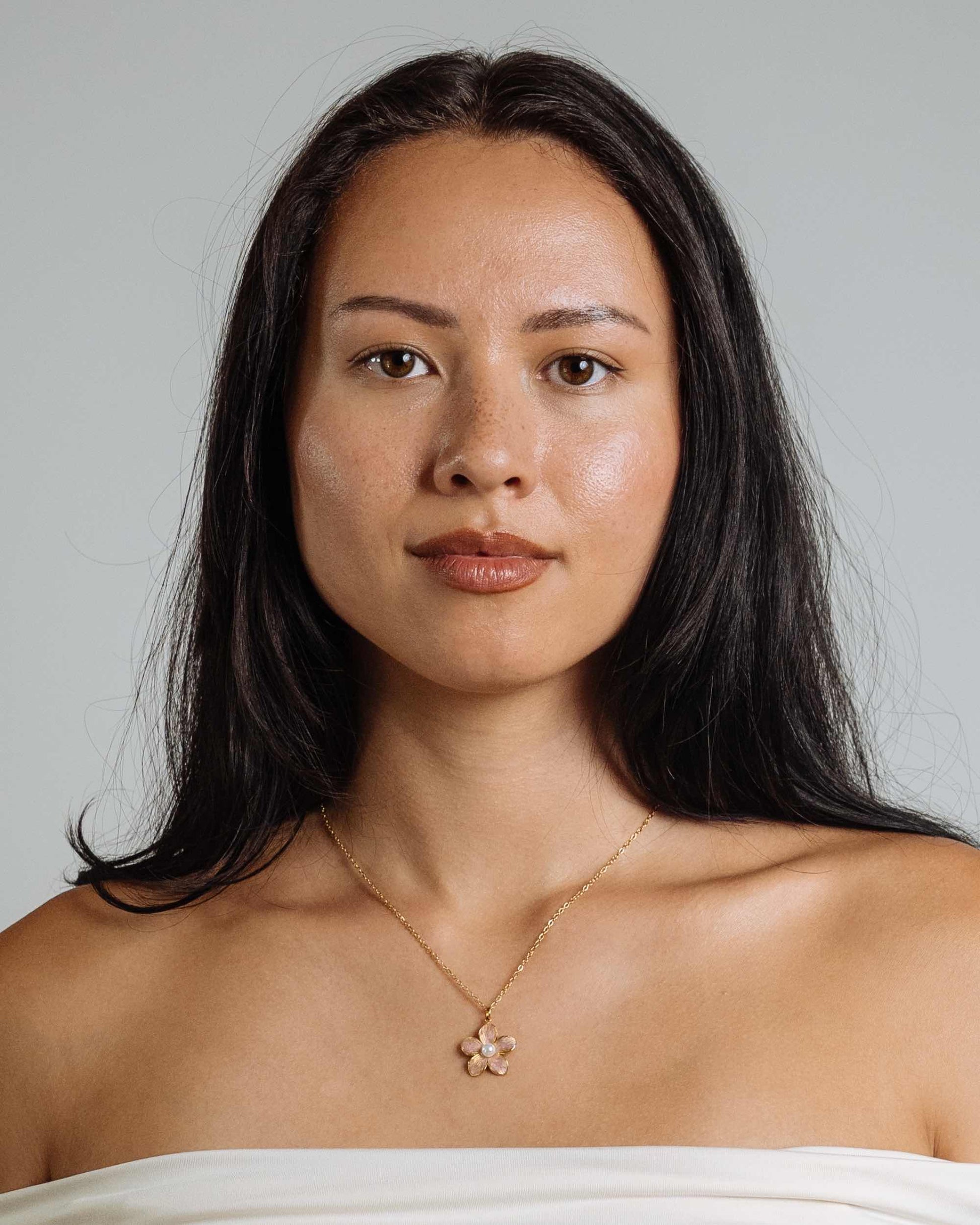 18-karätige vergoldete Kette mit einem wunderschönen Blumenanhänger mit einer Perle in der Mitte.