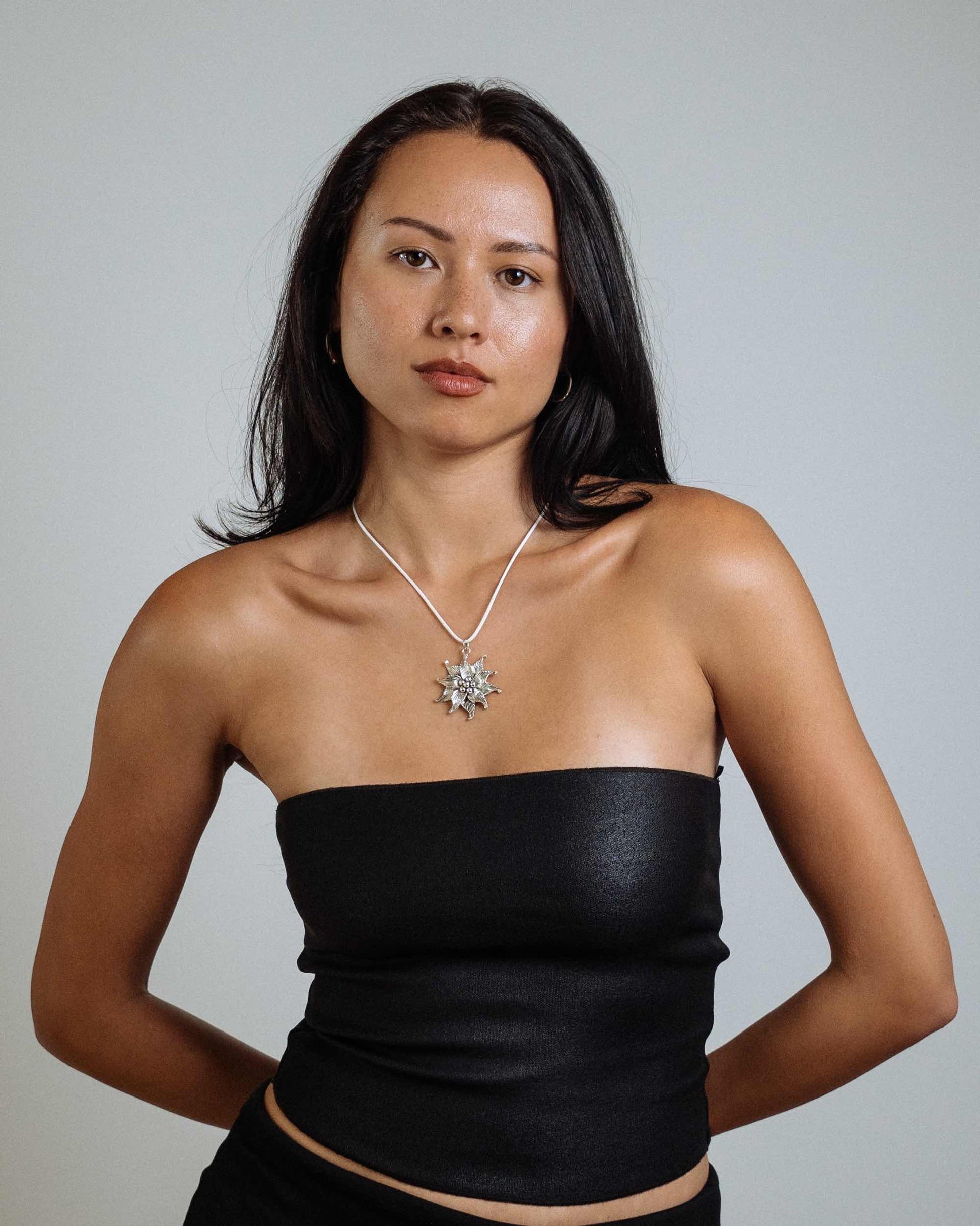 Raffiniert gestalteter silberner Blumenanhänger an einer verstellbaren weißen Lederkordel.
